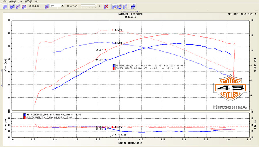 3200rpm以降から乱れていたA/Fもマップ修正で適正値に書き換えられ、整った様子になり、また、パワー・トルクも相当に増した様子が見て取れます。