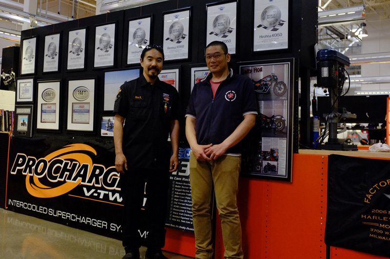フィッシュテールのソフテイルデラックスのお客さん(一日目のケーブルスロットル車のチューニングで用いた車両のオーナーさん)が来店されて、