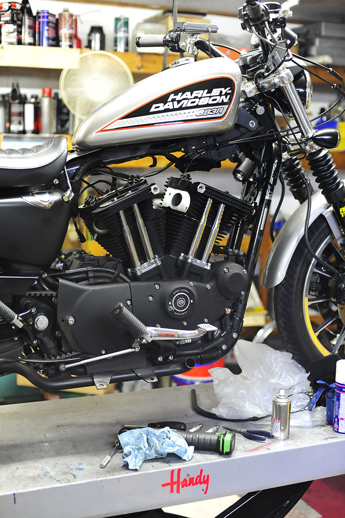 このウェブページで掲載しているハガーはキャブ仕様に対して、こちらの883Rはインジェクション仕様(2007年モデル)です。2万キロ走行後のオーバーホールをする感覚で、1000cc化を「ついで」にすることに。