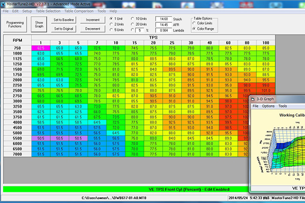 ボアアップするならば絶対に外せないインジェクションチューニング。排気量変更となるとインジェクションチューニングも相当高度な技術が必要となるが、45ディグリーでは1000ccスポーツスター用のオリジナルマップを作成済みである。ギア比変更に伴いスピードメーターの校正(キャリブレーション)も同時に行う。