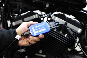 分かりやすい変化以外にもスポーツスターは外観では判りにくい変更点があり、BCM(ボディコントロールモジュール)が搭載されCan-bas化されたりと電装系で大きな変更点がある。そうするとこれまで通りに対応出来なくなってくるのが通例で、今回も同様でした。6ピンのデータリンクコネクタにパソコンとの通信ケーブルを差し込む