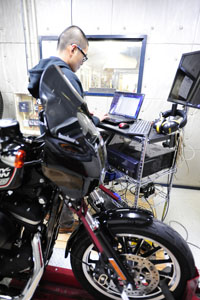 これについては低回転~中回転の低負荷~高負荷にかけ、大幅に見直した。特に、負圧領域からの点火タイミングを丹念にチェックし純正に対してマイナスの値を加え、低回転の高負荷時にはハーレーVツインらしい走行フィーリングも意識し慎重に進めた。走行フィーリングについて