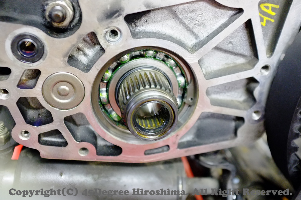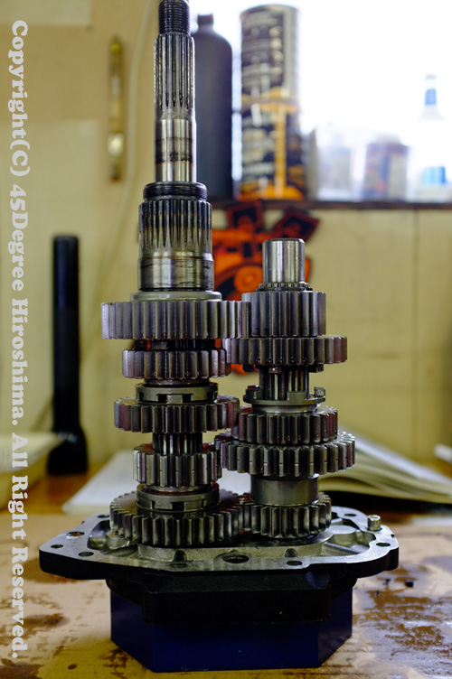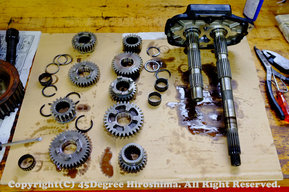 ただ、破損した部品のなんらかが「脱落」してミッション内の、あちこちに・・・と思うと冷や汗。特に、メイン・カウンターシャフト上を回るギアーにガチコーンと噛みこんでいないか、それだけが気がかりでした。最悪、噛みこんでいたら・・・・ギアー欠損、ミッションケース割れ・・・。なんて事も有りうる事態ですが、結果的には、それらは大丈夫!大丈夫!!!!