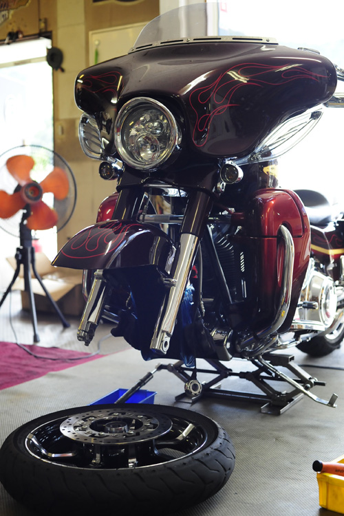 朝から2010年の、FLHXSEの、タイヤと、ブレーキパッドの交換です!