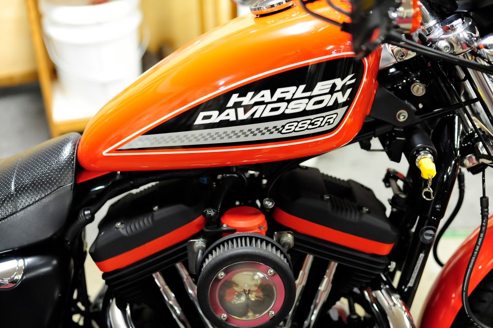 ビタミンカラーでもあり、ハーレーのワークスカラーでもある、レーシングオレンジなXL883R。