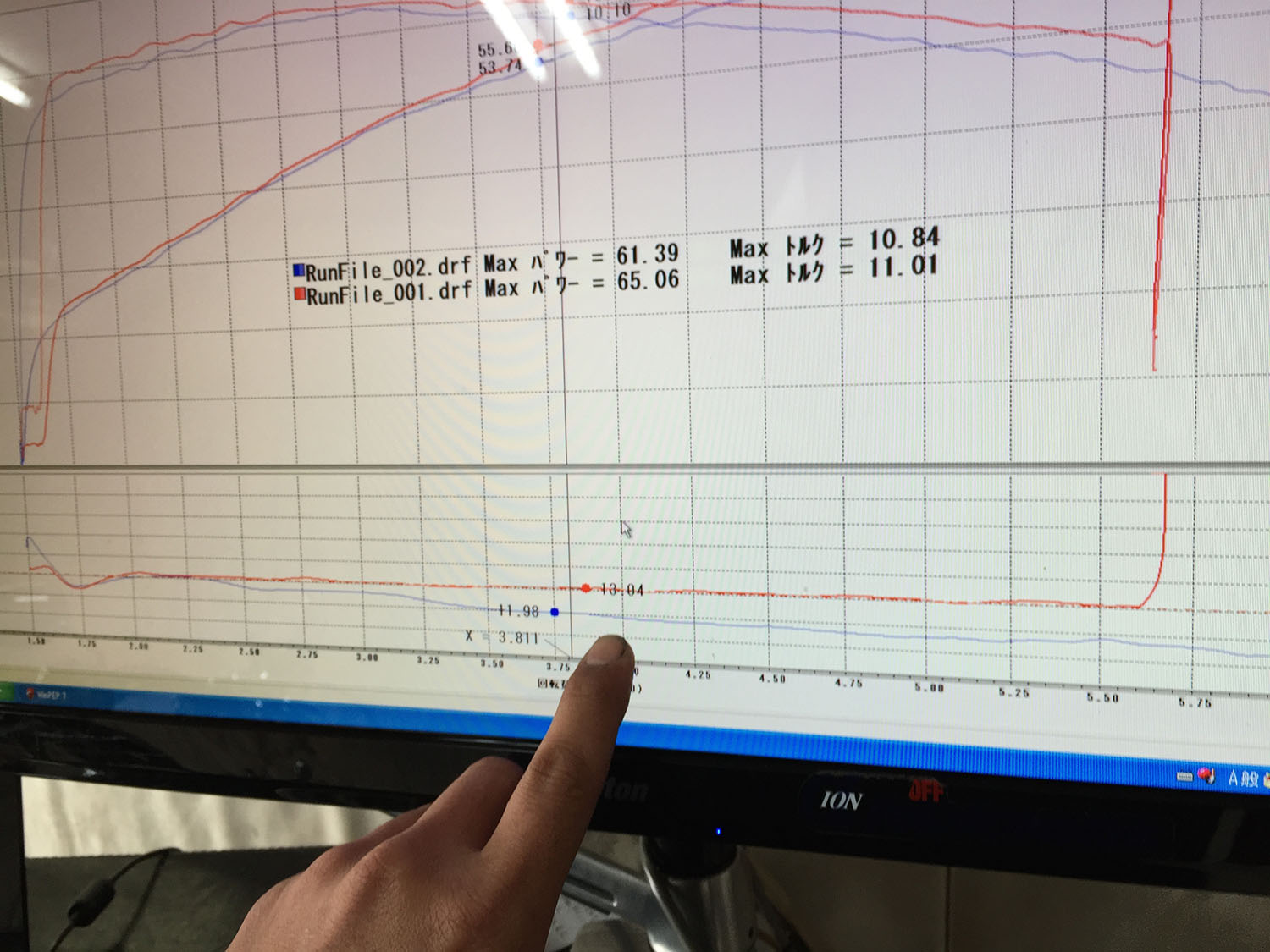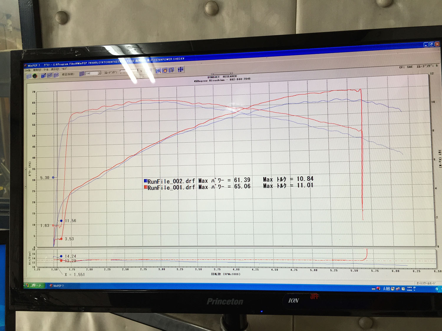 チューニング後、全開100%スロットルでのロールオン、空燃比グラフも真っすぐ一直線です。