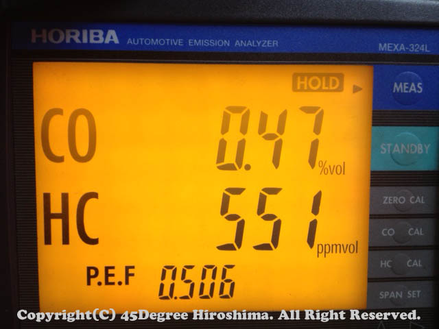 現行で適用される一番厳しい規制値を基準としてもCO、HC共に問題なくパス出来る値です。(この値はO2センサーレスでの値です)