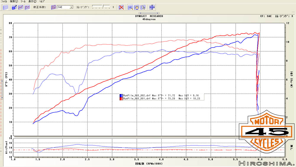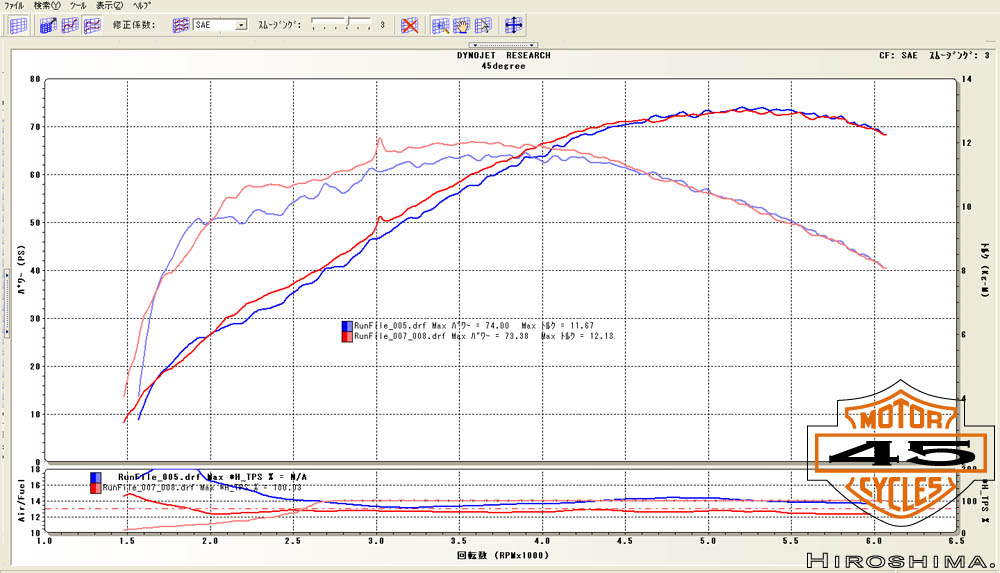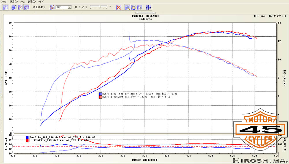 マスターチューンでのセッティング後と、XR1200ノーマルとの比較をオーバーラップさせたグラフを載せますね。