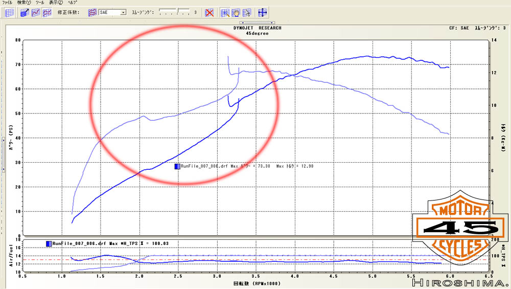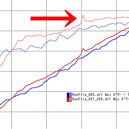 赤丸で囲った所のグラフが、妙なトメ、ハネ、になっています。これ、クラッチの滑りでグラフがおかしなことになっているのですが・・・・セッティングして元気になりすぎてクラッチが滑っちゃった・・・・!???いえ、これたぶんクラッチに取り付けている部品の摩耗が考えられます!