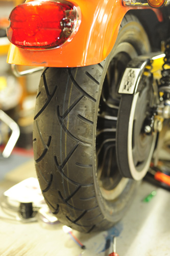 先日ご成約頂いたFLSTSCの納車整備を進めます。タイヤ交換と・・・