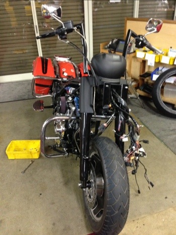 ツアラーへドラッグバーを取り付けてイメージを掴む。ツアラーへドラッグバーも新鮮でよろしゅ御座いますがこの姿勢では時速300キロは微妙だろうと思いますが気分を盛り上げる為にも大事なんです。