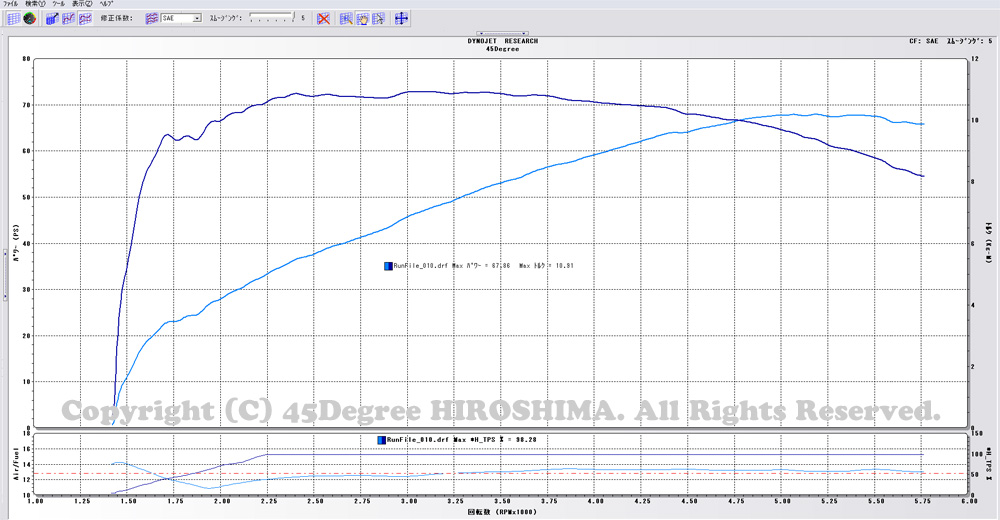 まずはパワーチェックで最大値の馬力とトルクを測定。68馬力 10.95kgが最大値でした。