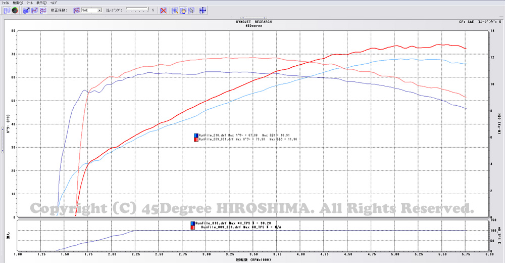 では、次にギアードライブ化されていない、普通のTC96と比較してみましょう。マフラーの性能でデーターに開きが出てしまいますので、比較の正確性を保つために、同じくスクリーミンイーグルロゴのマフラーが取り付けられたデーターとオーバーラップさせてみます。比較するため、迷わないように「青いグラフがこのソフテイルカスタム」であります。