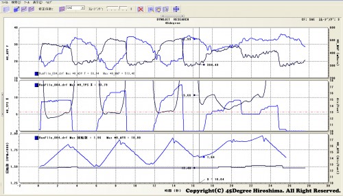 そのため、ECM本体を触らなくともいける、スキャンツールを用い、シャーシダイナモ上にて実際に動いているときの「状況」をロギングし診断する事にしました。