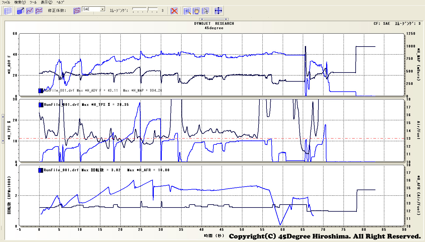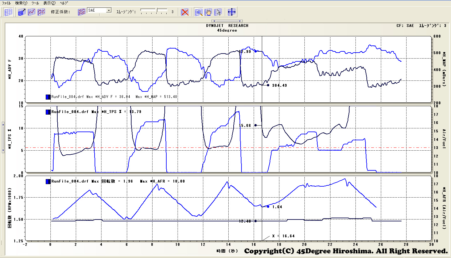 診断をしてみて解ったのは、目標空燃比は、アイドリングを含めた全域においてほぼ13(A/F)以下。12.5以下を主に使っている様子。そのため、その空燃比に狙って向かってしまう事からあまりスロットルを開いていない時にまで燃料を送りすぎている傾向にあり、しかし、目標空燃比に対して実際のA/Fは常に迷い気味で加速したい時に使うアクセル操作ではガソリンの供給が少なく、必要に十分なガソリンを送りはじめるのはワンテンポ遅れてから。巡航時の負荷がかかっていない時の点火タイミングも気になります。 燃費の、街乗りで6〜7km 高速道路に行くと21km前後になるというのも、頷ける様子が見れました。コンピューターが学習しますから・・・!よく聞く言葉かもしれません。しかし、その学習が、どれほど頼りになるのかもここで判ります。