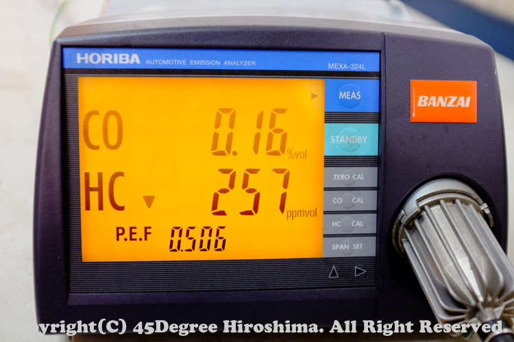 現行で適用される一番厳しい規制値を基準としてもCO、HC共に問題なくパス出来る値です。(この値はO2センサーレスでの値です)