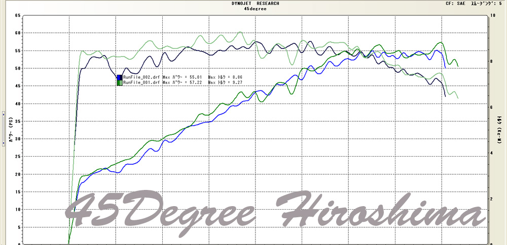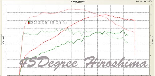 純正状態で最も良いデーターだけ残し(緑色のグラフ)、それとオーバーラップして比較。結果は「馬力は20ps」、「トルクは約4kg-m」それぞれアップしました。