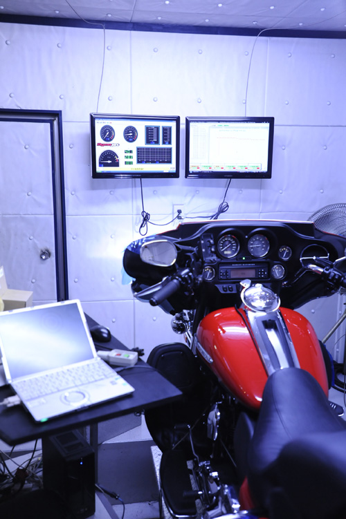 サンダーマックスECMを用いてセッティング中。実走行に近い状態で負荷をかけて動作チェックをしているところです。走ることに集中しなくても良い環境であればサンダーマックスから送られてくるモニターに集中できます。こうすると意外な事が判るのですよ。