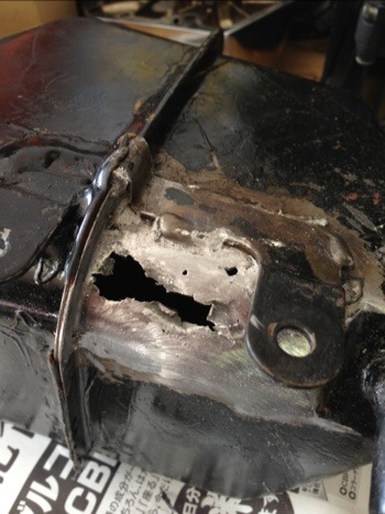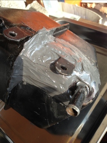 大穴が空いた所が丁度塞がる程度のプレートを板金して準備しておき、プレートがオイルタンクに出来た大穴を覆う事で「アレ」との相乗効果を狙う。トラスコさんでGetしてきた「アレ」をプレート裏に適量塗布。元々、エポキシパテやハンダで盛ってあった箇所にも、「アレ」を塗布して、「アレ」が推奨するいい感じの厚みになるように盛っていき内部に空気が残らないように塗り広げた。