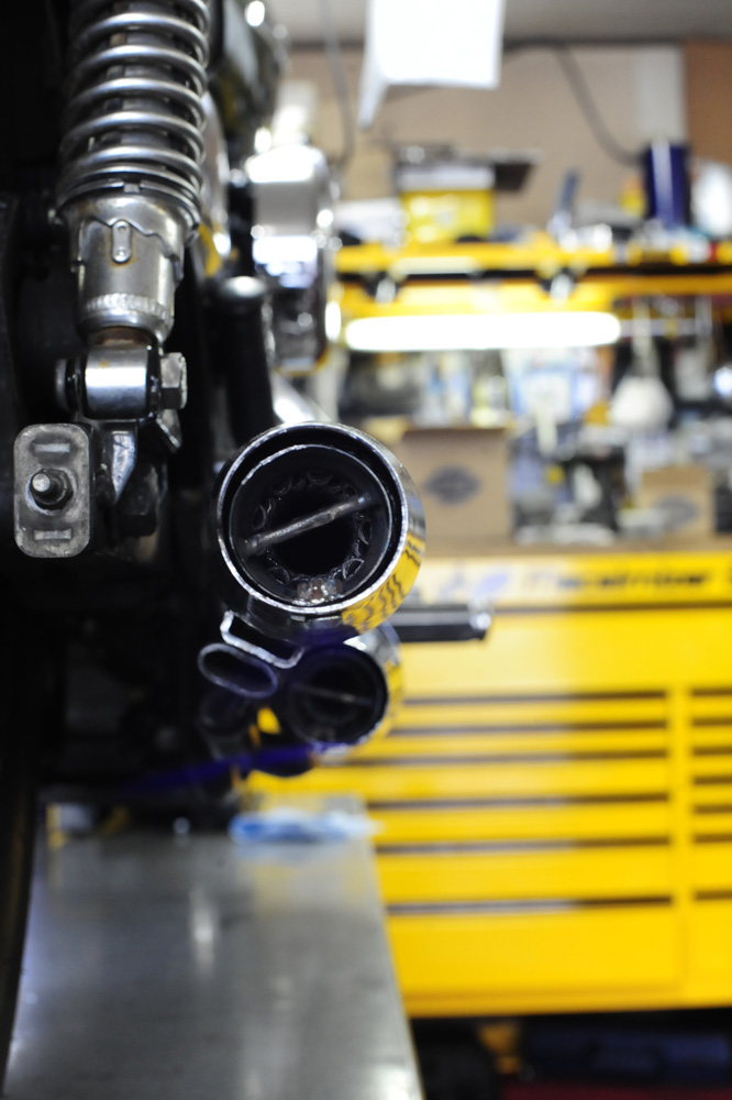ストックのサイレンサーのバッフルが抜き取られてしまっていたので、ルーバーバッフルを加工して取り付け。ハーレーらしさを残した適度な消音。アクセル開け始めからのピックアップが良くなり、トルクの盛り上がりも増えるので好評です。