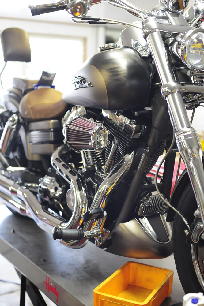 96ci ........ 1580cc, FXD Dyna, Injection インジェクション, インテーク(吸気), エアクリーナー, シャーシダイナモを用いたチューニング, スーパーチューナー FXDFSE ダイナファットボブCVO チューニング前準備 2013/06/11 Dr.マサ 2009年モデルのFXDFSE ファットボブのCVO入庫 エアクリーナーを パフォーマンスマシーン製のファストエアに交換!!!似合ってますヨ! こちらの車輌、元々SE PROスーパーチューナー使用につき、チューニングにはそれを継続使用して行います。 次はダイノルームからお届けします。 ではでは マサでした
