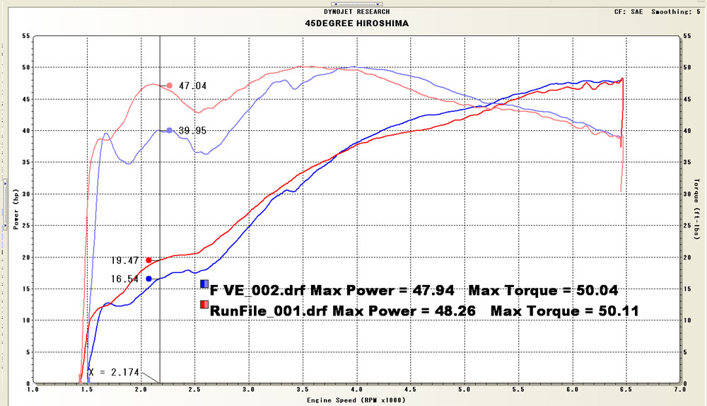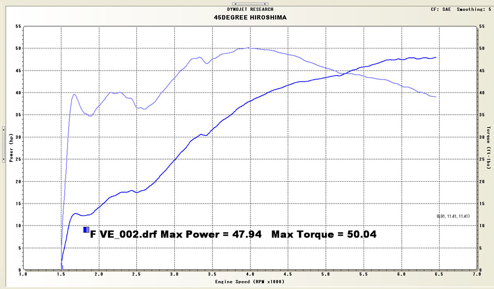 こちらがSlant 2 into 1をチューニングしたダイノグラフですが、これホンマにチューニングしたんか!!と思うようなグラフです・・・。出来上がったVEマップを見ても、サンダーマックスでいわゆる学習というアレでは、絶対に上手く行かない典型です。O2センサーで読み込んで補正かけていこうと思ってる人がもしいたら、それは諦めた方が無難です。