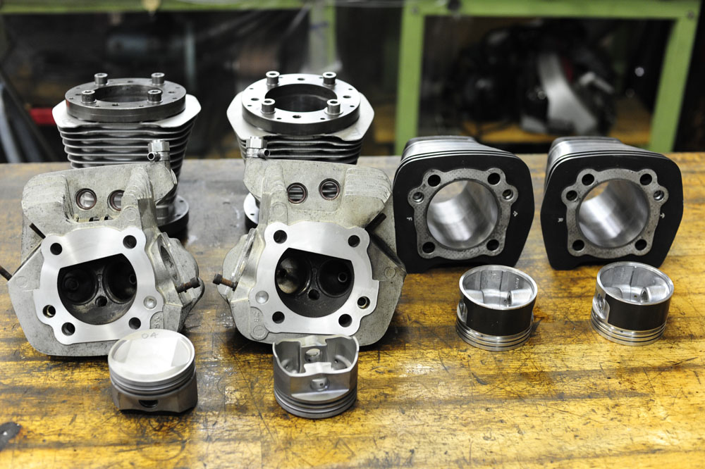 左側は次に取り掛かるエヴォの腰上部品。右側は現在組立中のヘリテイジのシリンダー&ピストンです。