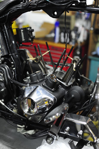 写真には撮ってないですが、ボアリングから仕上がってきたシリンダー内部洗浄、ピストン・ピストンリングのギャップ調整などを済ませて、シリンダーを組み込んだ後にシリンダーヘッドに取り掛かりましたが・・・