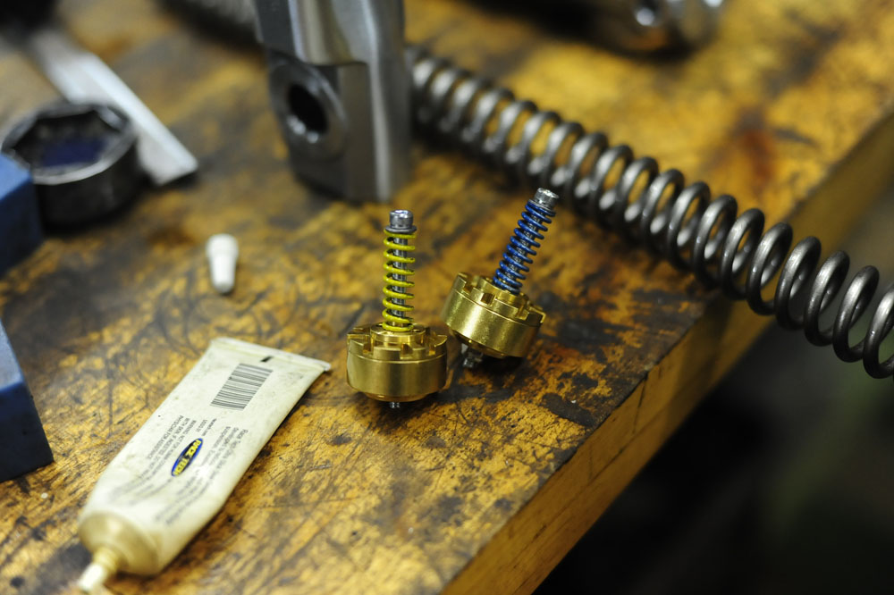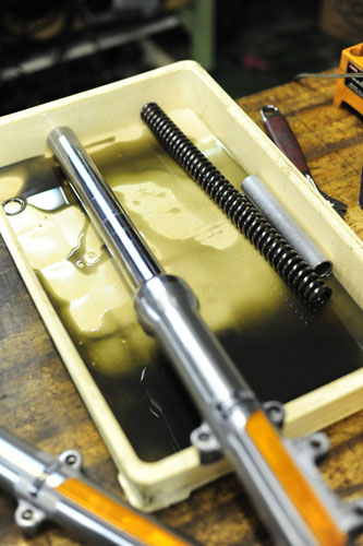 チューニングには、僕が慣れ親しんだレーステックのスプリングとゴールドバルブという減衰力調整機構をフォークへ追加し、トータルで調整を行います。