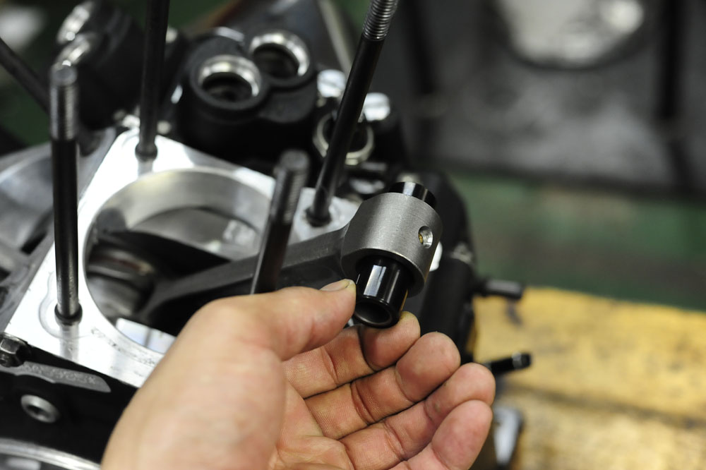 ピストンピンにはシングル処理後にDLC(ダイアモンド・ライク・カーボン)を施す。同じDLCでもフロントフォークで行ってるDLCとは種類が違います。