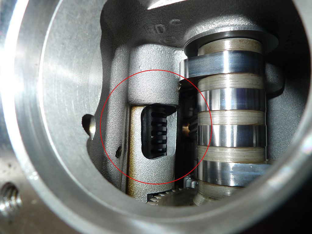 80ci ........ 1340cc, Evolution,エヴォリューション, エンジン, オーバーホール 開けてビックリ 2014/06/23 Dr.マサ エヴォの腰上修理の案件。 カムシャフト交換の為カムカバー外すと。・・・・おっっとーぉ! ギアが欠けてるの、判ります? ブリーザーギアと呼ばれる部品。ちなみに樹脂ギアです。 ブリーザーギアが損傷をうけ、動きが止まってしまうと、エラい事になってまうんですが、今回の様に開きっぱなしの位置で止まっていれば「あの症状」が出ずに壊れている事は解りませんね。開けてみなきゃ判らない事の一例でっす。