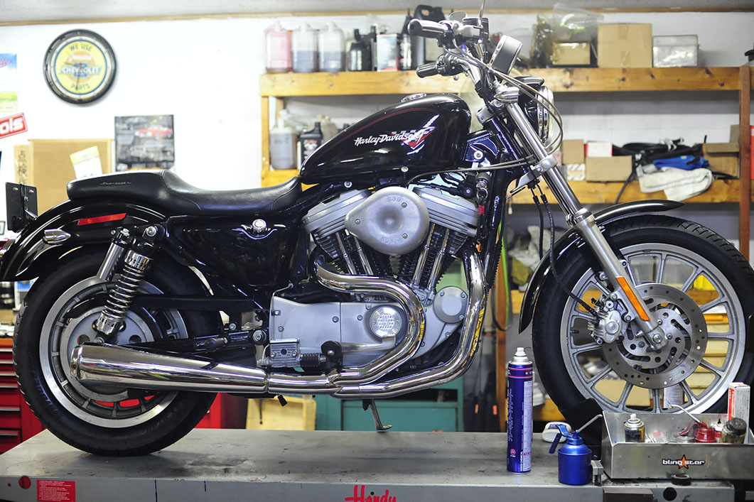 試運転に出かけると、村上からフロントがグニャグニャだというアピール。期待通りのコメントに安心したのは言うまでもなく。とりあえず、これで走ってみなーと前後のサスを調整して渡してみた。1200S系と00y以降のFXDXは標準で足回りがカートリッジ式なのでこうして調整して遊ぶ事も出来るので、社外ショックに換える前に遊んでみるのも手です。