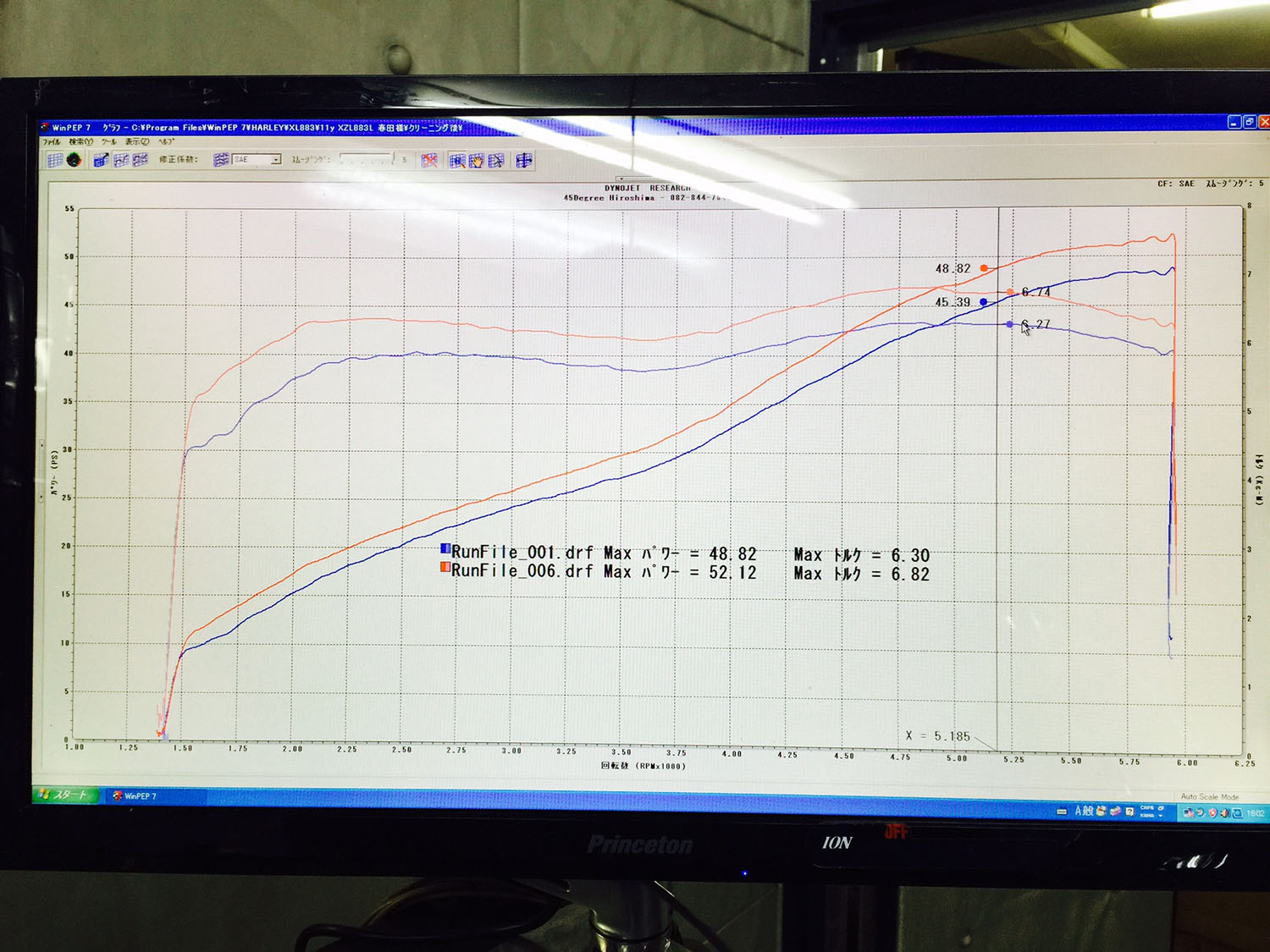 ビフォー・アフターです。点滴後は52馬力と、上々です。ちなみに。3速でレブリミットの6000rpmまで回した場合の車速はメーター読み130キロほどでした。実際のところ、走行抵抗(風・負荷)などが絡み、無負荷で計測するダイノ上とは異なりますが、パワーカーブを見る限りは6000回転まできっちり使えるエンジンです。高速走行時の、お馬さんが4頭違うのは、体感出来るものでしょうね。お楽しみに(^^)