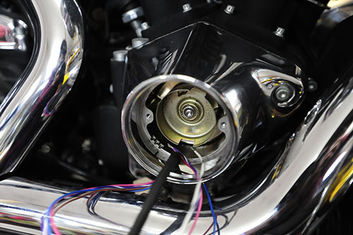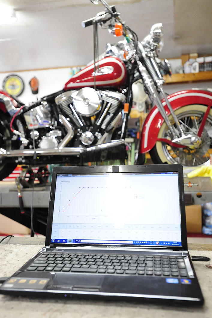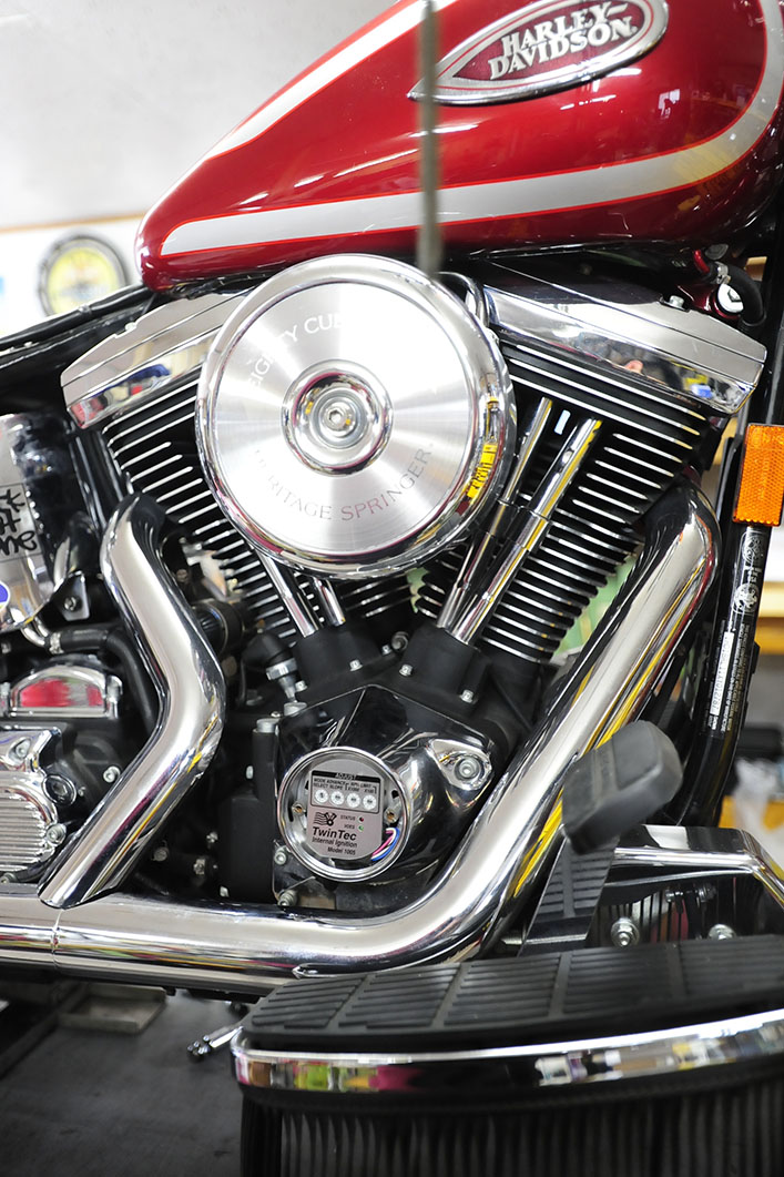 80ci ........ 1340cc, Ignition(点火), ソフテイル(FXST/FLST), ツインテック(TwinTec) エヴォ乗りの「願い」叶えましょう✨ 2015/03/16 Dr.マサ 最終エヴォ 99y FLSTSピットイン。 TwintecインターナルイグニッションModel.1005へ交換、本日仕上げにて承りました。 ダイナSが取り外され。 複雑な動きをする機械進角装置のガバナーから シンプルなセンサーで読み取るだけのローターに交換。 組み付けが終わり 通常はこの製品、オプション設定されているパソコンでの書き換えも、45ディグリーではそれを含めて行います。 ガバナーに代わって、プログラムで打ち込むので良い走りといい音が両立できます。点火を良くすると、エンジン始動も、加速も、音も、アイドリングも変わります。 試運転して確認後、納車。乗った感じ如何でしたか?ありがとうございました。
