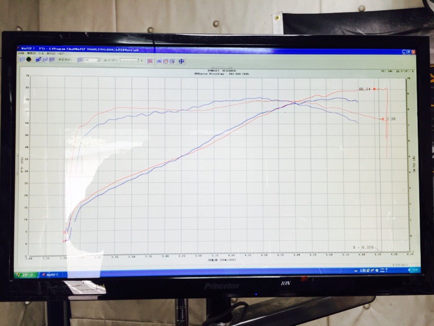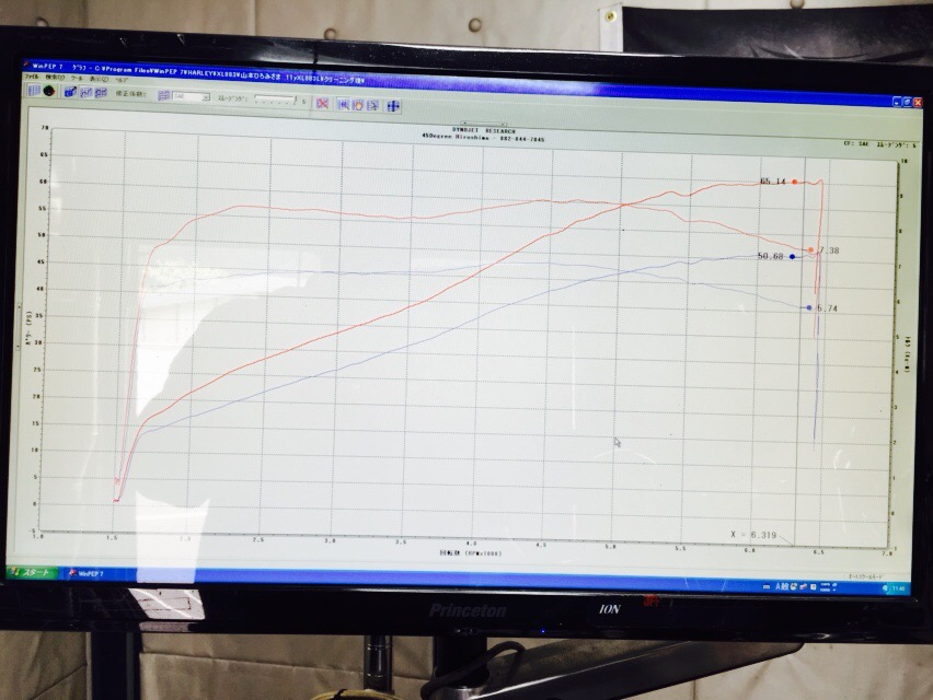 こちら、チューニング後のダイノグラフです。65馬力に到達してますね〜。