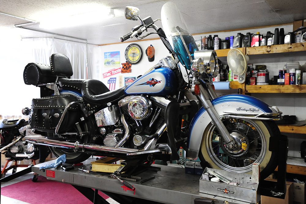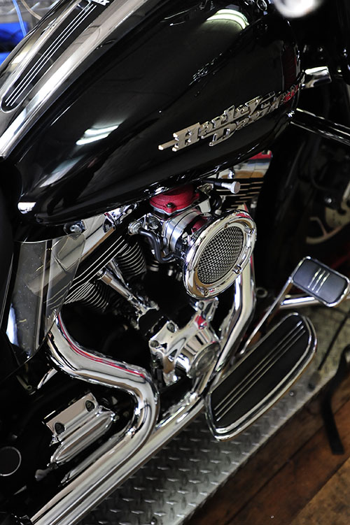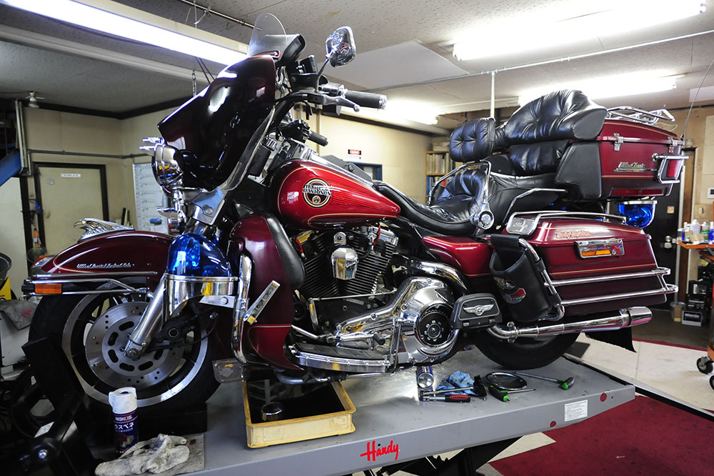 W様 2006年式FLHX。朝からリアタイヤ交換後の、キャブチューニングです。エキパイ変えたら、走りがモッサーとなったとか。