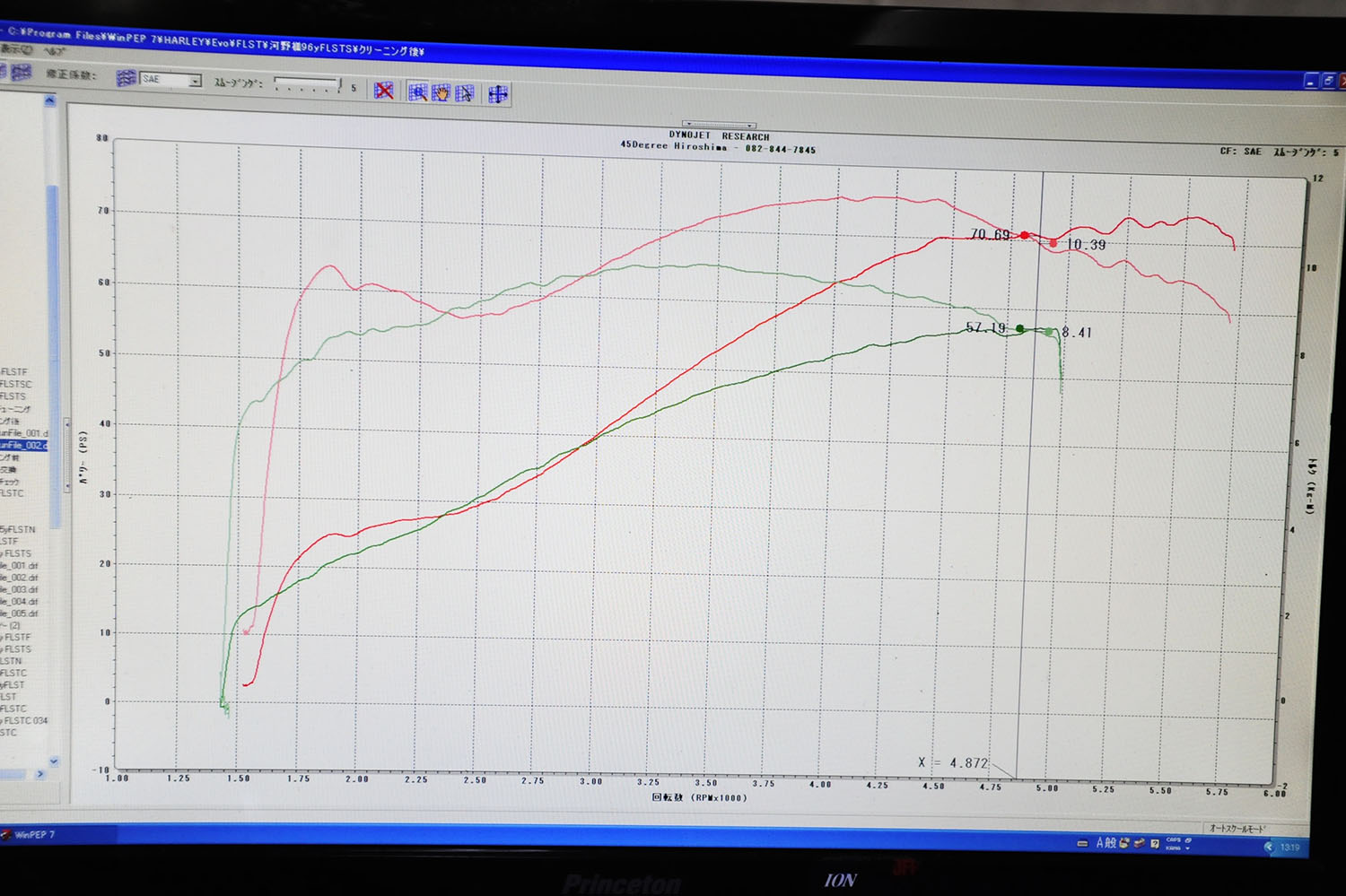 チューニング完了っ。15馬力ほどアップしましたよ。65馬力になったFLHX。65ストグラ!