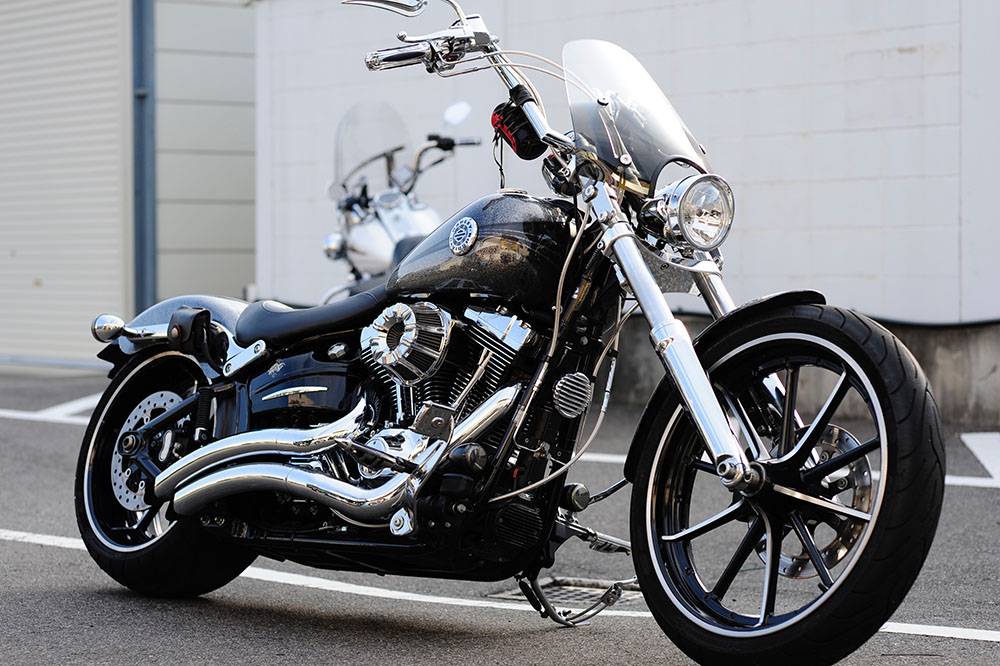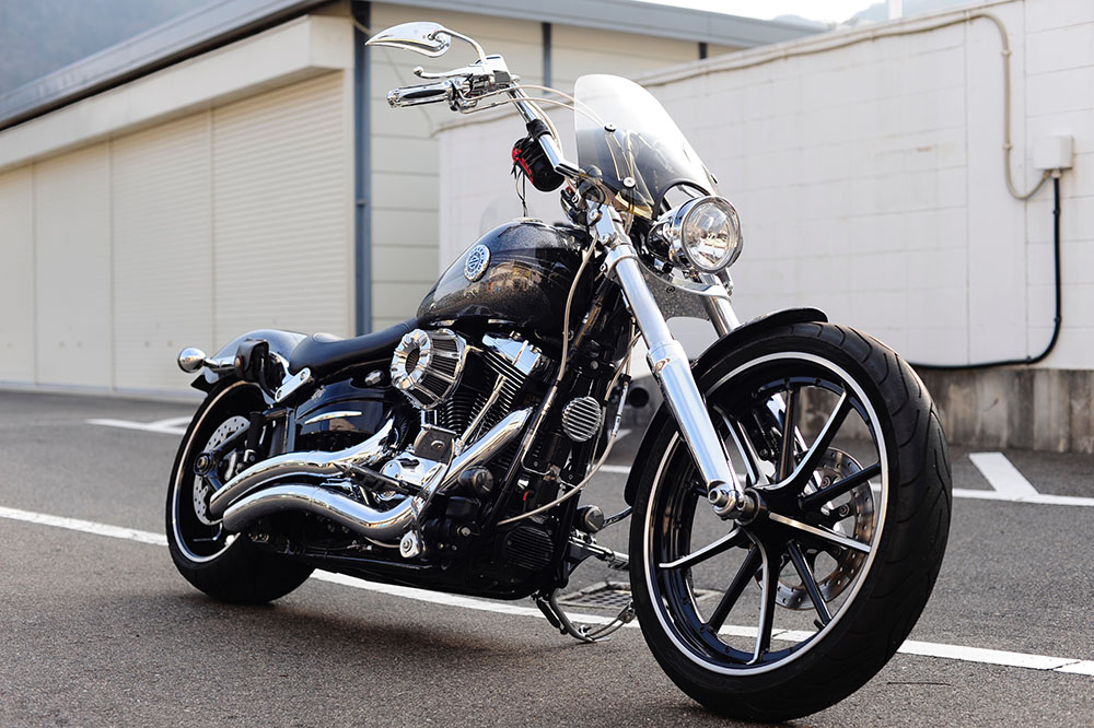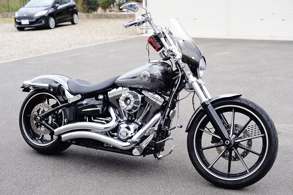 いつだったかの記事で「ブレイクアウトはフロントを伸ばしたほうが似合う」と書いたんだけど記事が見当たらない…ん、それはどうでもいいんだけども。以前からブレイクアウトはフロントを伸ばしたほうが堂々としたルックスになるな、と思っていました。今回カスタムを承り、完成。「ふふっ。どーよ?」と言いたくなるほど似合ってます♪ABS装着車両はフォークを伸ばすのも楽じゃない♪ ボトムケースはクロームめっき、正解♪ ブレイクアウトはクロームがヨォ似合う♪