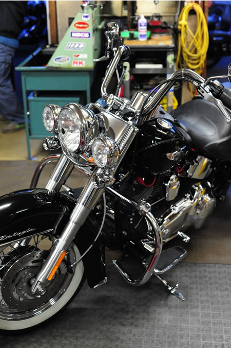 以前は後ろに引っ張った「プルバックライザー」FLSTN乗りの皆さんは良くご存知ですね。それを変更しました。今回チョイスしたのは「背の低いライザー」ですが、そうすると、後ろに引っ張ってない分、ハンドルとの距離が遠くなってしまいます。それをハンドルで近づけるのも手ですが、よぉーく考えてみると、動けるモンが動けば、エエヤン! ね。