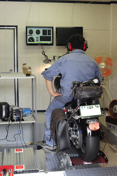 エンジンも組みあがってシャーシダイナモ上でローラーを回して仕上がりを確認中・・・・オイルの漏れとかキャブのセッティングなどなど。