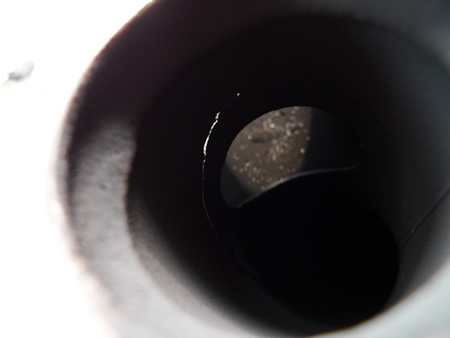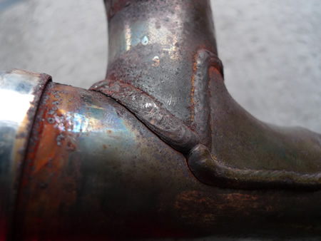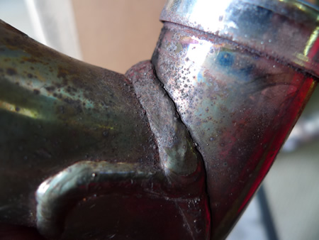 Exhaust マフラー, FLH(ツーリングモデル) 実はよくある亀裂・・・ 2009/06/24 Dr.マサ こちら、ツーリングモデルのエグゾーストパイプ。車検で点検整備をしていた際に見つけた亀裂。リア側、左右に振り分けている付近の、エグゾーストパイプどうしを繋げる溶接の淵から亀裂が走っていました。高年式でもよく見つける亀裂です。よーく診ないと判らない亀裂も、一気に口がバックリと広がりますのでご注意ください。