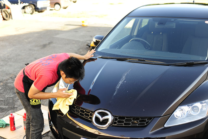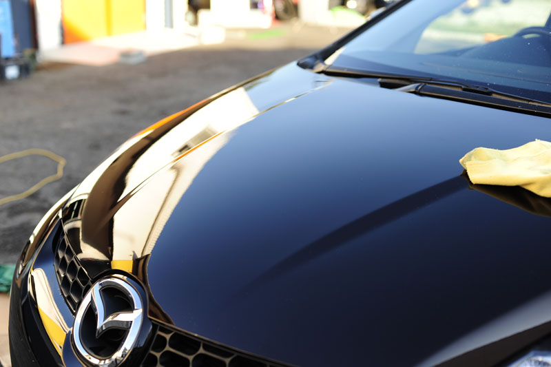 ここから更にハンドグレーズで光沢を出し、純正と同じコーティングをかけていきます。コーティングは剥れかけてくると見れたものではないので基本的に否定派ですがCX-7は巨大なボディなので、コーティングの力を借ります。バイクだったら小さいからね!