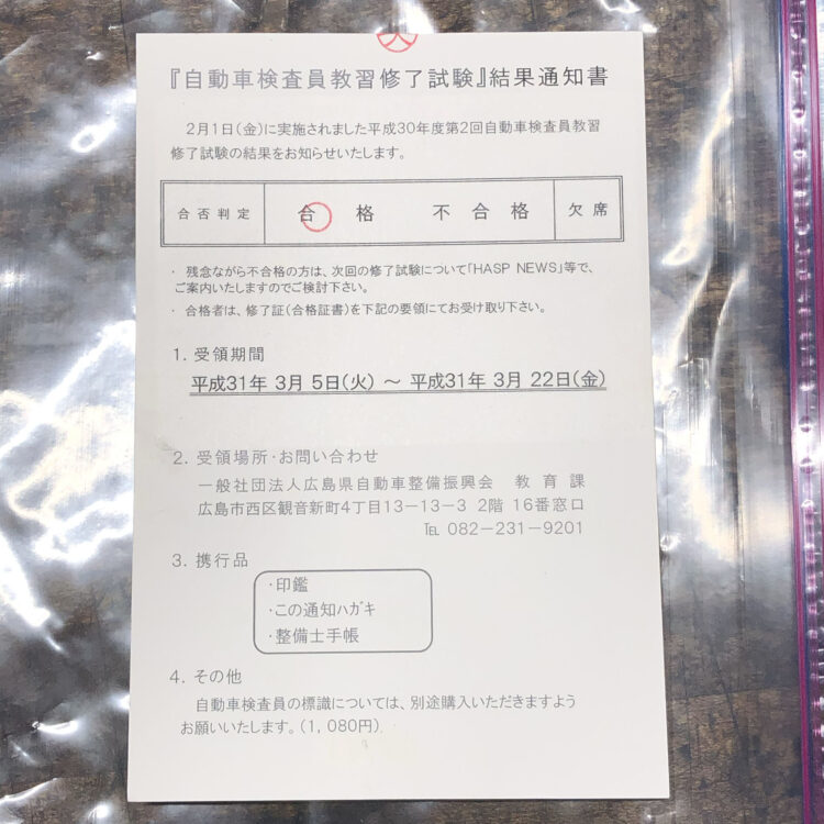 自動車 検査員修了試験 合格!
