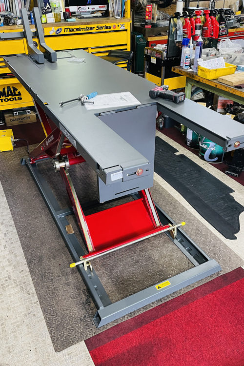 45からお知らせなど トライク車両対応 バイクリフト / 設備紹介 2021/05/25 Dr.マサ トライク車両の入庫も絶え間なく、リフトを3輪対応に致しました。重たい車両もパワフルに持ち上げます。 もちろん通常の二輪も問題なく、イザという時、前後タイヤを落とせるよう開閉式のパネルが装備されてます。(リアは、一人じゃ、使えないかなー….苦笑) これにて、リフト3機体制になりました。