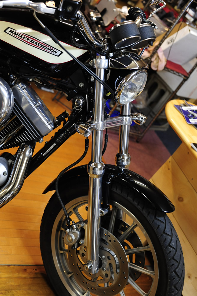 フロントフォークには、ゴールドバルブ(http://www.45degree.net/Tuning/sus/racetech.htm)をインストールし、1インチローダウン。その際にフロントフォークに磨きをかけ、ミラー仕上げになっています。(http://www.45degree.net/work_polish/1.htm) ここまでになると、維持は簡単。ホワイトダイアモンド等で簡単に磨いて、メンテ、よろしくです!
