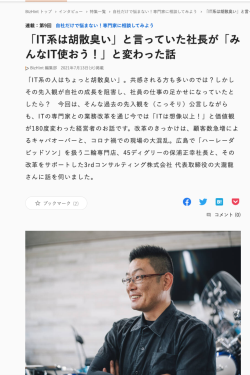 BIZHINT(ビズヒント)さんから直々に取材申し込みがあって、弊社のセールスフォース環境を構築して頂いた3rdコンサルティング代表の大瀧さんと絡んで取材に挑みました。