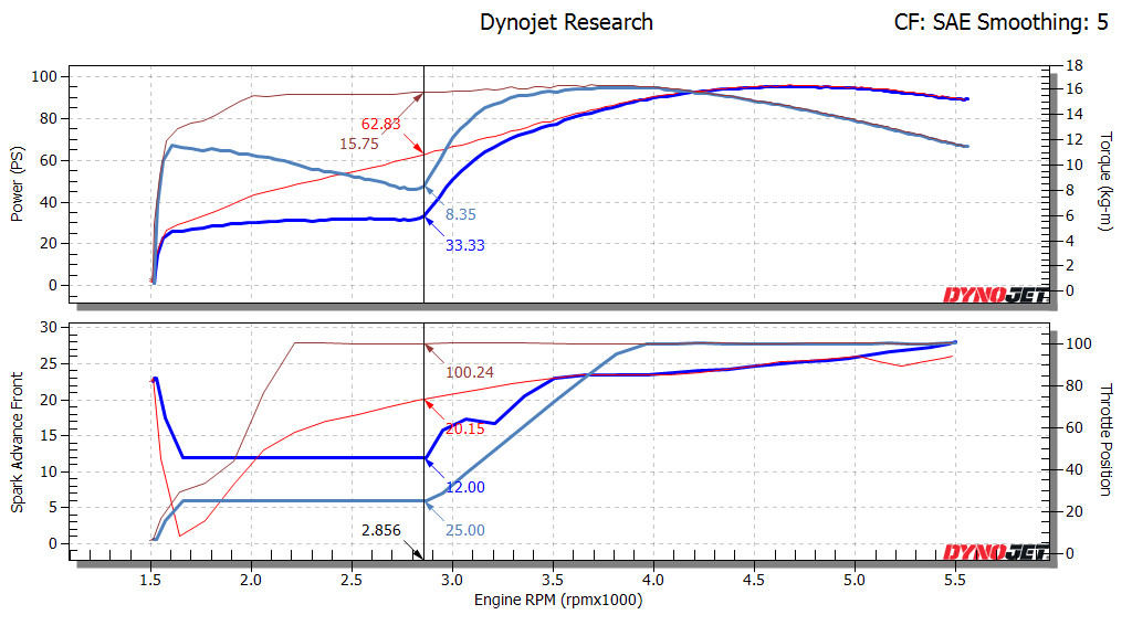 とても同じ車両から得られたグラフには思えない比較だが、本当にチューニング前の同一車両から得られたもの。これ、どういった状態で得られるものかというと、理由は明確。ある条件が重なったときに起こるメーカー標準仕様のギミック。