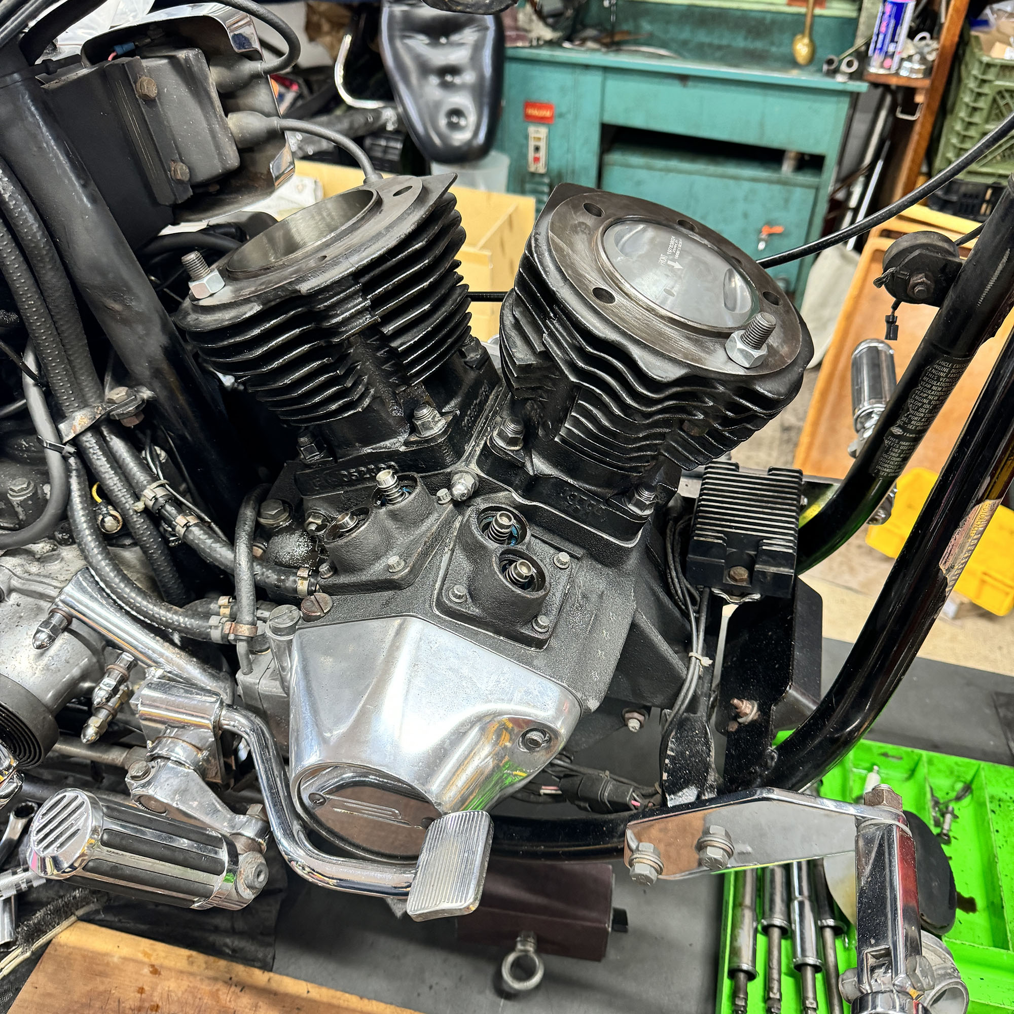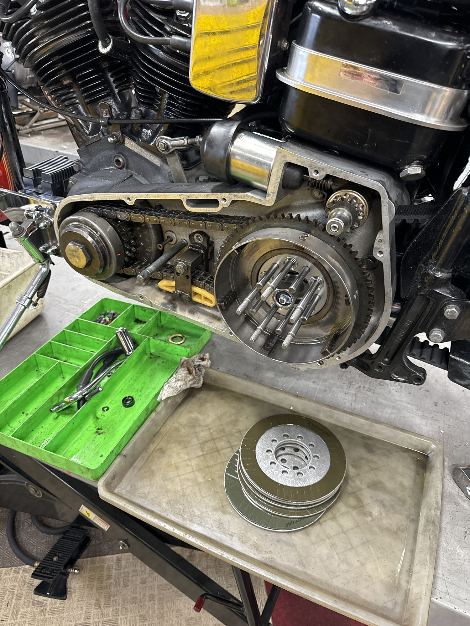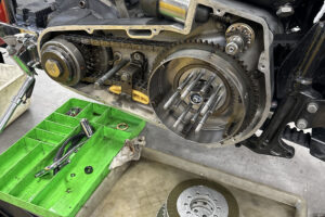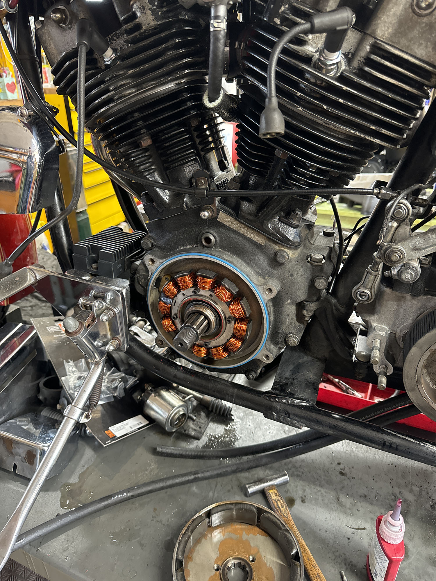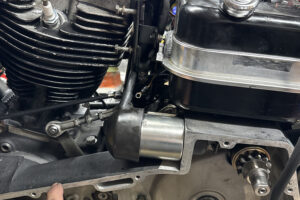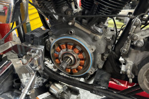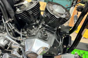 クローズド・プライマリー加工を施す。この時代はエンジンのオイルポンプからプライマリーチェーンへチョロチョロとオイルが供給されていた中途半端な湿式クラッチ状態だったが、エンジンからの供給をとめ、プライマリーを塞ぎ、十分なオイルで満たして常時潤滑を行う、現代のやり方へとアップデート。こうすることで部品の摩耗だったり、腐食などを防ぐことができ、状態の変化を大幅に防ぐことができる。ただ、元々がオイルで満たして使うようなことを想定されてないため、オイル漏れが多発するところだがピッタリ止めることに成功している。ここはノウハウが多数存在する。補足に、ステーターコイルも交換し未来の不具合を予防。