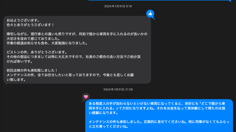 その後はハードなメンテなんて何もせず、乗りたい時にエンジンが始動し、走って帰ってオイル漏れもなく、オイル交換もそろそろしたほうが….なんてご案内をする程度にトラブル知らずで乗っているようです。まるで使い方が現行車のようですね。ハハハ。