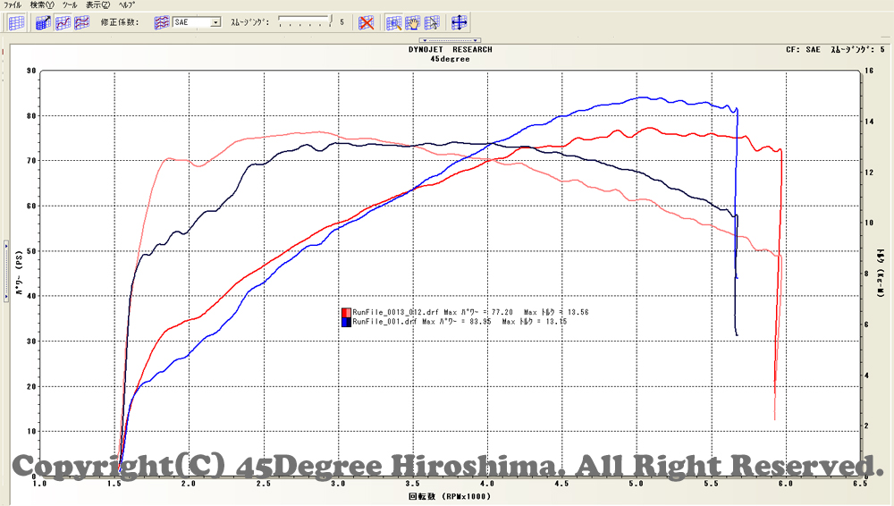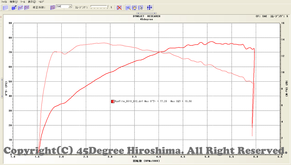 スーパーチューナーを用いて セッティング後のパワーチェック。馬力は77馬力ですがトルクは13.6キロです。